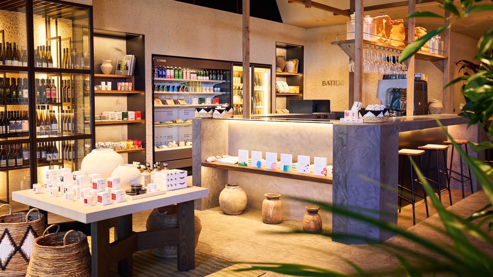 The refined boutique inside Batida — offering a curated selection of unique island gifts, artisanal drinks, and gourmet products.