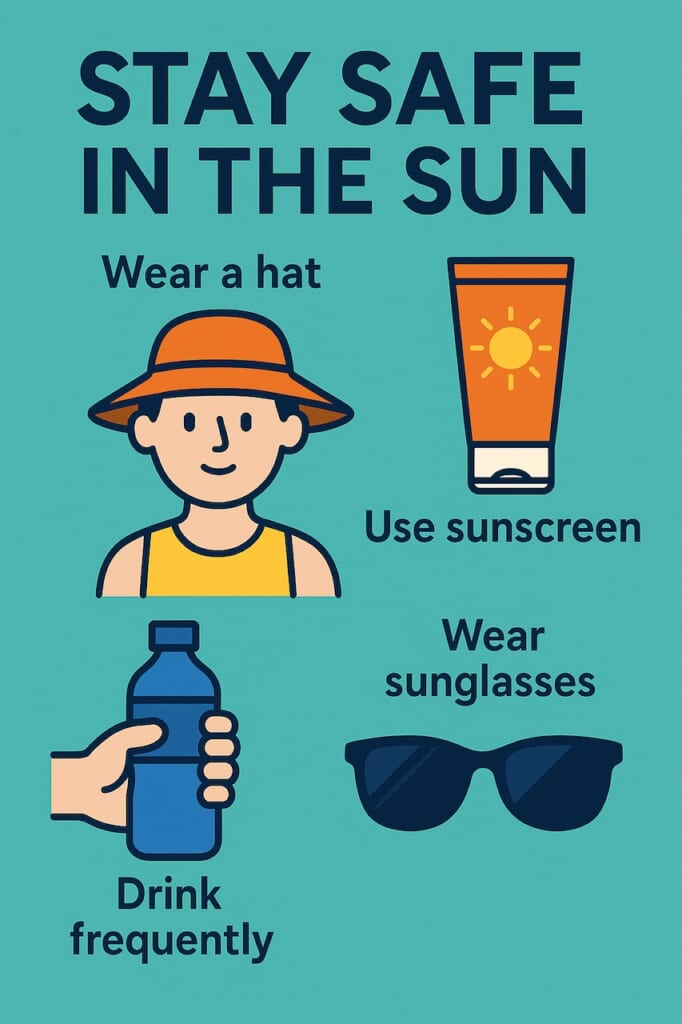 • Avoid direct sun between 11:00–14:00.